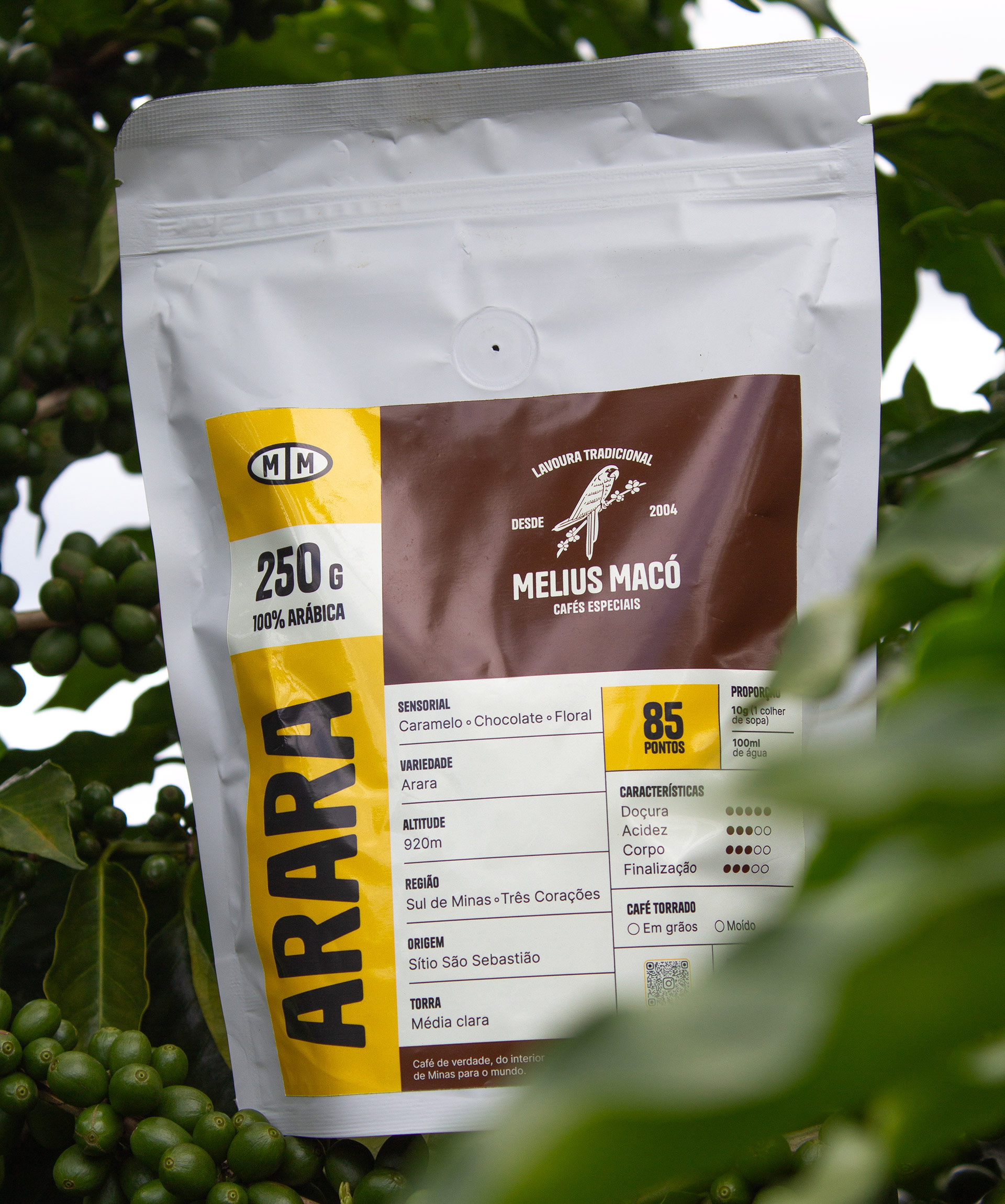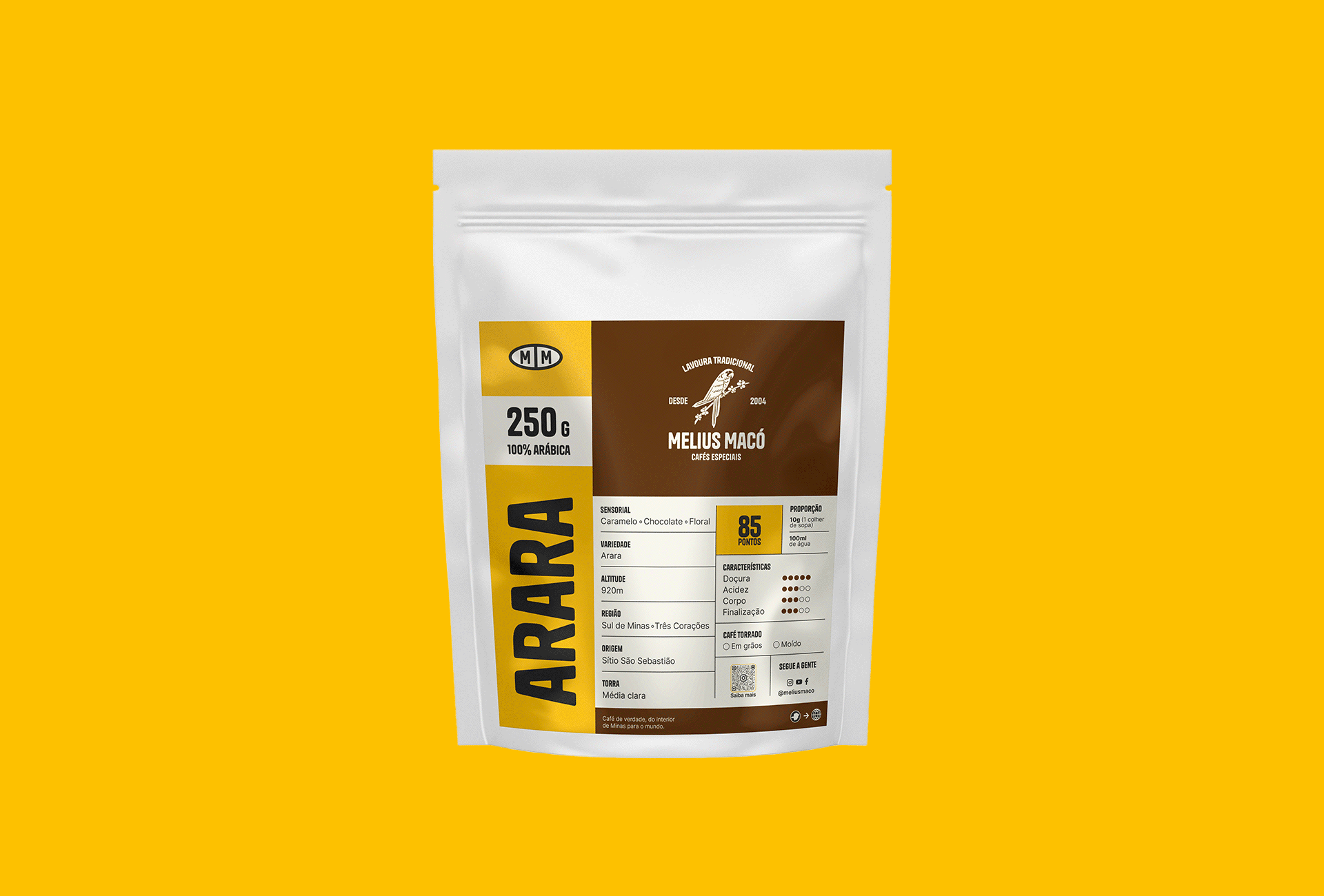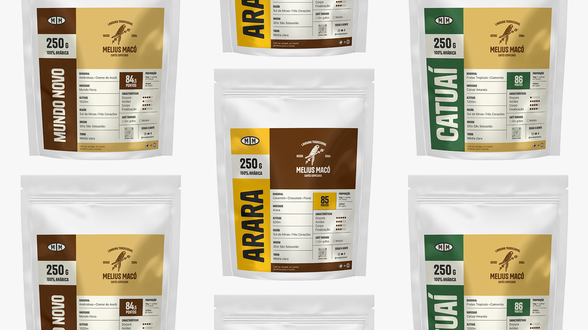 The verbal and visual identity were crafted to embody the brand's attributes: efficient, light, and robust. The naming, colors, and symbol were all developed based on the preferred variety of coffee by producers, which happens to be the brand's main product.
