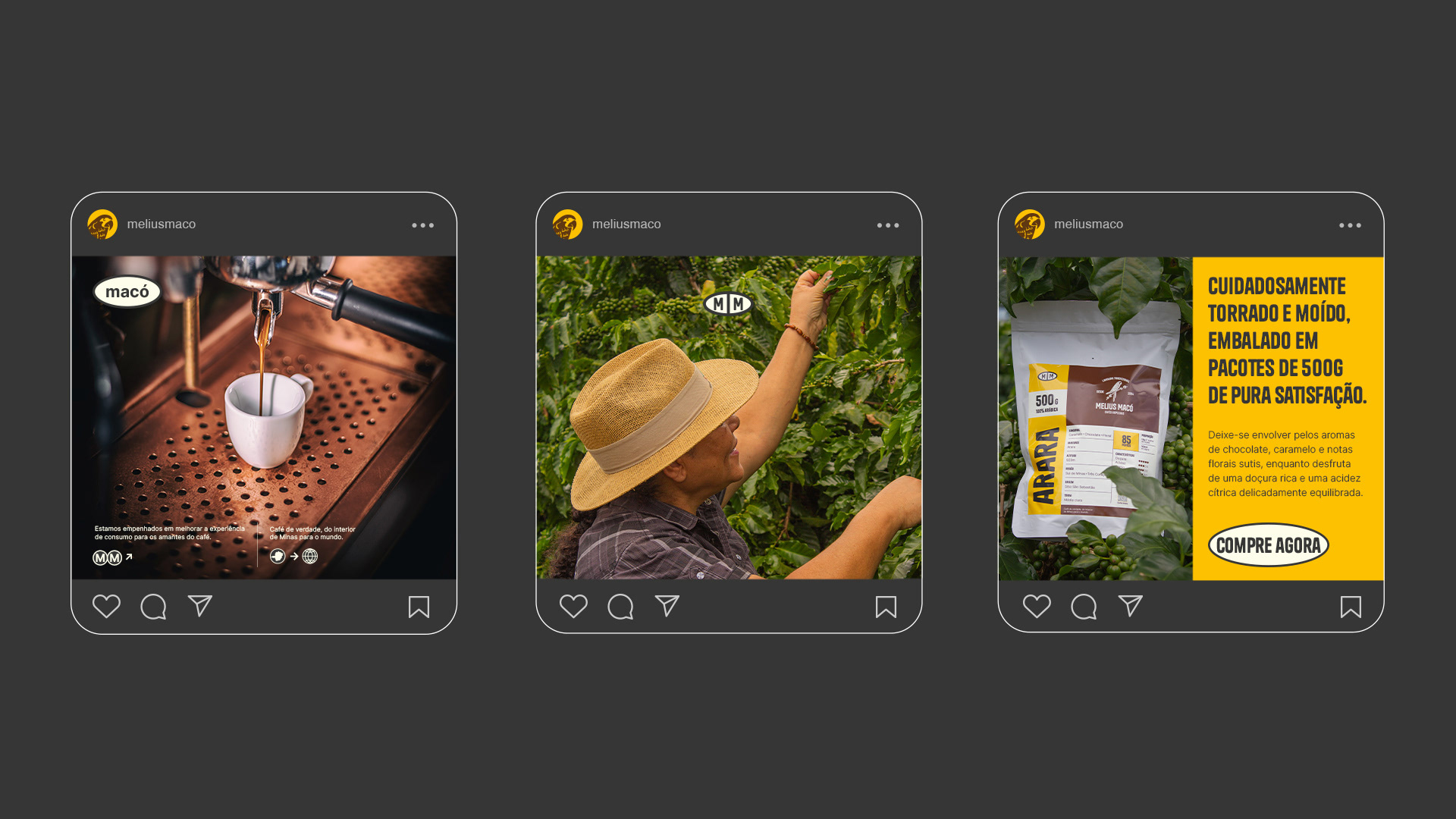 A identidade verbal e visual foram criadas para refletir os atributos da marca: eficiente, leve e forte. O naming, as cores e o símbolo foram criados com base na variedade de café preferida dos produtores, o principal produto da marca.